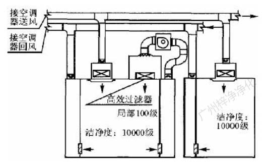 此方式的缺點是設置循環(huán)風機箱及處理噪聲,需要較大的空間,而通常百級區(qū)周圍風管都比較密集,需要精心布局。此方式百級區(qū)上部靜 壓箱相對百級區(qū)室內為正壓,頂棚高效過濾器與吊架間的滲漏,為靜壓箱流向室內,直接影響百級區(qū)潔凈度。對施工質量要求較高。(具 體可參考: