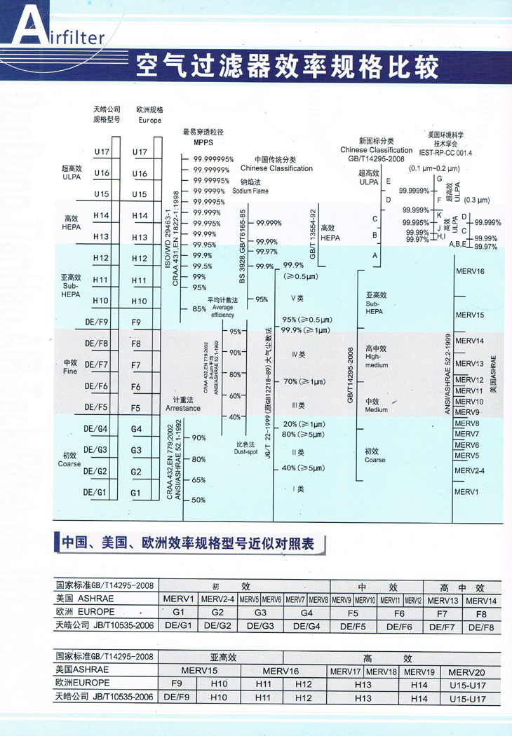 國(guó)內(nèi)外最新空氣過(guò)濾器效率規(guī)格表:
